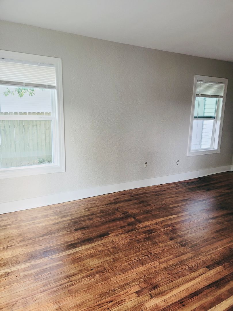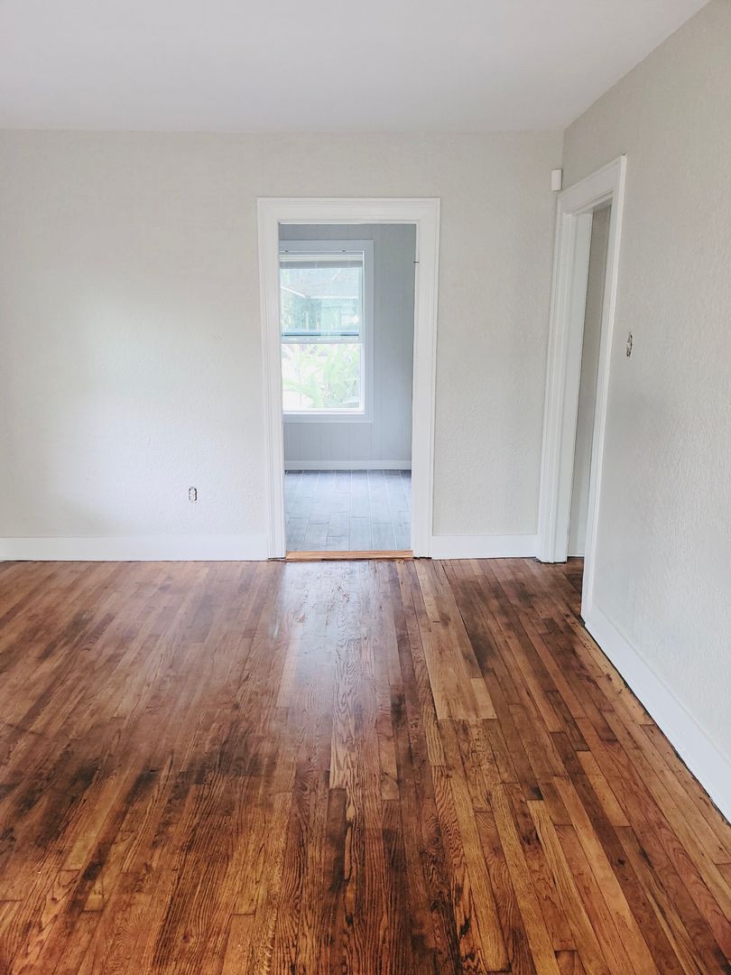 Spacious, 2 Bed/1 Bath home for rent. Amenities include hardwood floors, central AC, refrigerator, stove, paved driveway, and large fenced in backyard.
